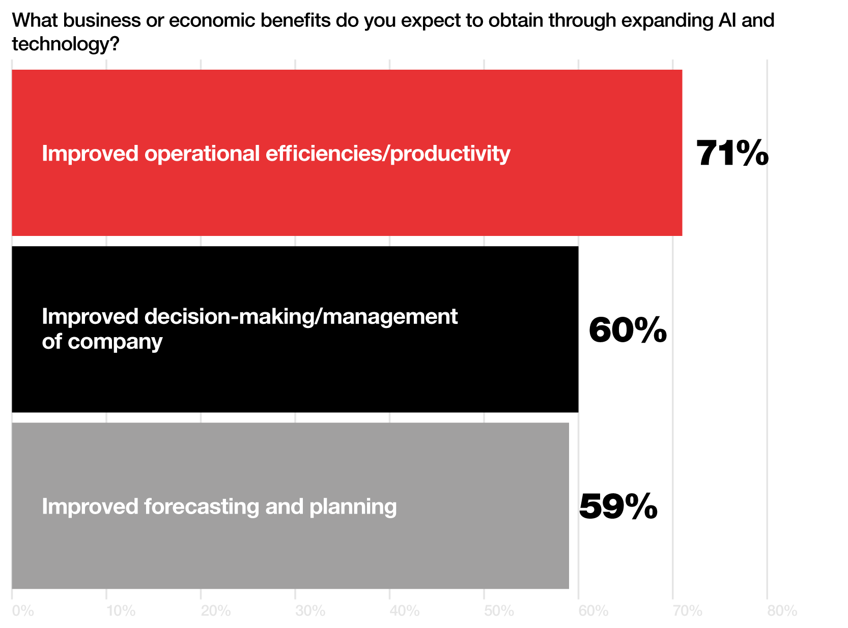 Middle market leaders are realizing tangible benefits from AI and technology, with gains in productivity, forecasting, and data-driven decision-making. The most anticipated outcome is greater operational efficiency, followed closely by improved decisions and enhanced planning.