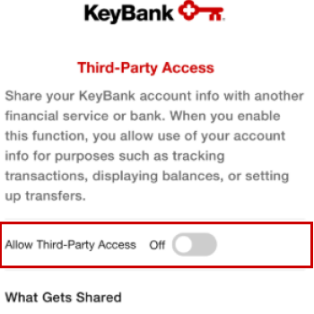 KeyBank provides a secure way to share your financial data with trusted third-party services and apps that you might use to track your spending, make transfers between accounts at different banks, and more. Find out more about how third-party access works and how you can set it up in online banking.1
