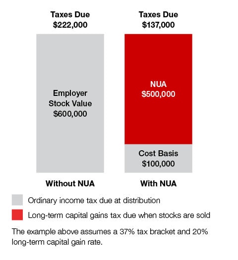 Two bar charts that highlight the difference in taxes due on $600,000 of employer stock. On the left, an all-grey bar chart denoting ordinary income tax due at time of distribution, resulting in $222,000 taxes due. On the right, a stacked bar chart with a grey portion on the bottom labeled Cost Basis of $100,000 signifying that ordinary income tax was due, and a red portion on top labeled NUA denoting the remaining $500,000 incurred long-term capital gains tax when sold, resulting in total taxes due of $137,000. This example assumes a 37% tax bracket and 20% long-term capital gain rate. The implication of the chart is that the Net Unrealized Appreciation Strategy yielded a tax savings of $85,000 compared to ordinary income tax.